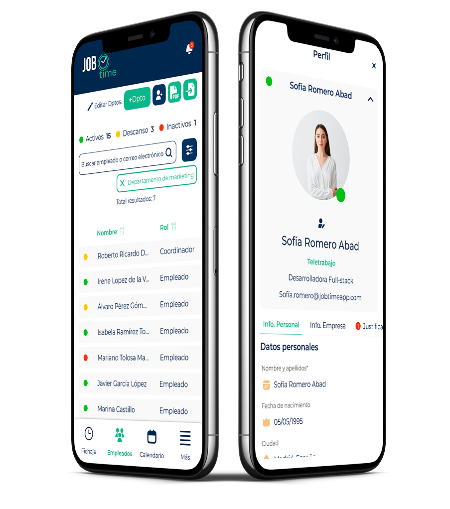 En Jobtime tendrás el control total de las jornadas laborales, ausencias y la estructura de la empresa, todo en un solo lugar. Olvídate del papeleo y las complicaciones, y dedica más tiempo a lo que realmente importa: el bienestar y desarrollo de tu equipo.